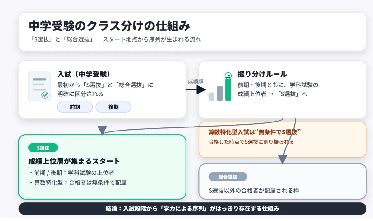 まず、中学受験では「S選抜クラス」と「総合選抜クラス」に明確に分かれており、前期・後期ともに学科試験の成績上位者がS選抜に振り分けられます。さらに算数特化型入試の合格者は無条件でS選抜となるため、スタート地点から学力による序列がはっきりと存在している仕組みだと言えるでしょう。
