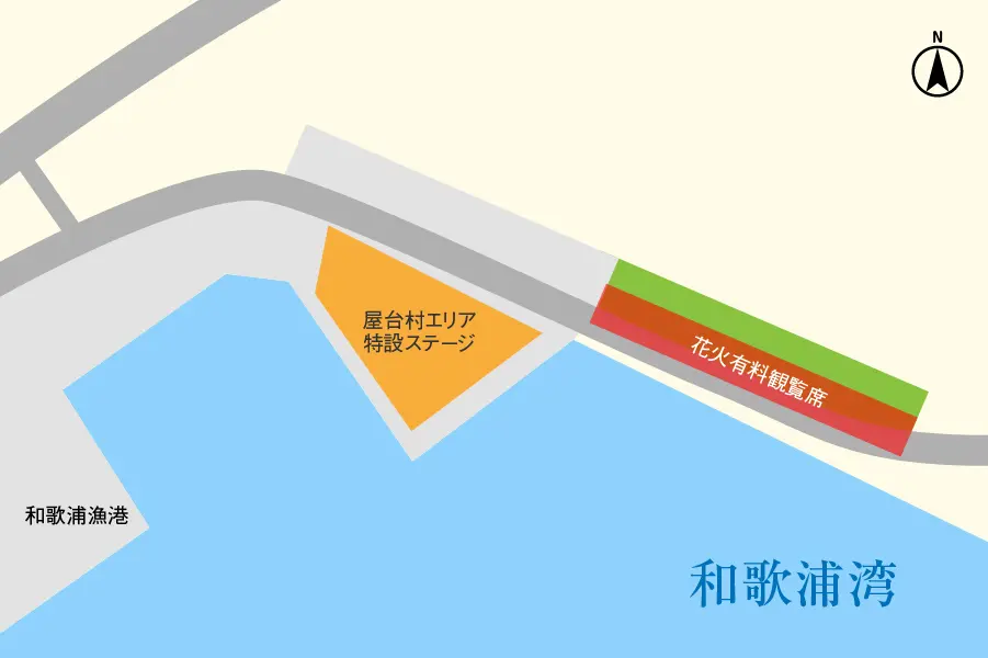 和歌浦花火大会2025の会場となる和歌浦漁港には、屋台村エリア、有料席エリアなどがあります。公式サイトやパンフレットに掲載される地図を手元に用意し、「自分がどこから入って、どのあたりで観覧し、どのルートで帰るか」をざっくり決めておくと迷いにくくなります。