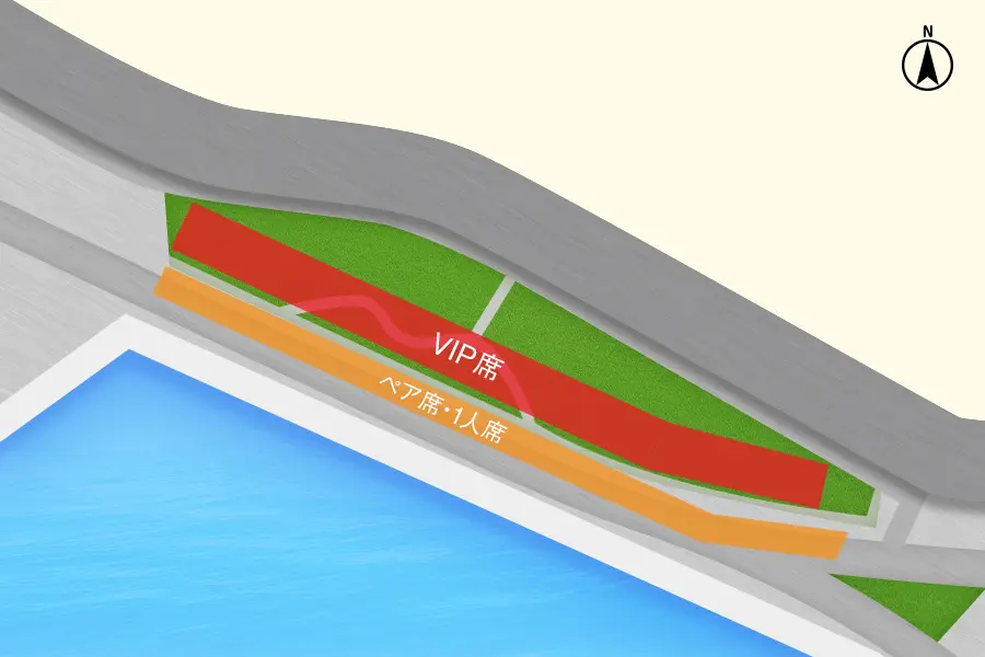 ゆったりと観覧できるVIP席、ペアで並んで座れるペア席、一般席など、複数の選択肢が用意されています。たとえばVIP席であれば、ステージや打ち上げ方向に対して近い位置が確保されており、ワンドリンク付・フードチケット付きとなっています。