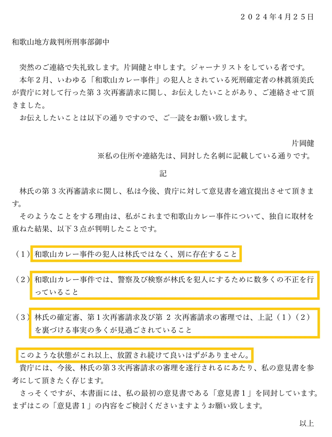 林真須美氏は一貫して無実を主張しています。