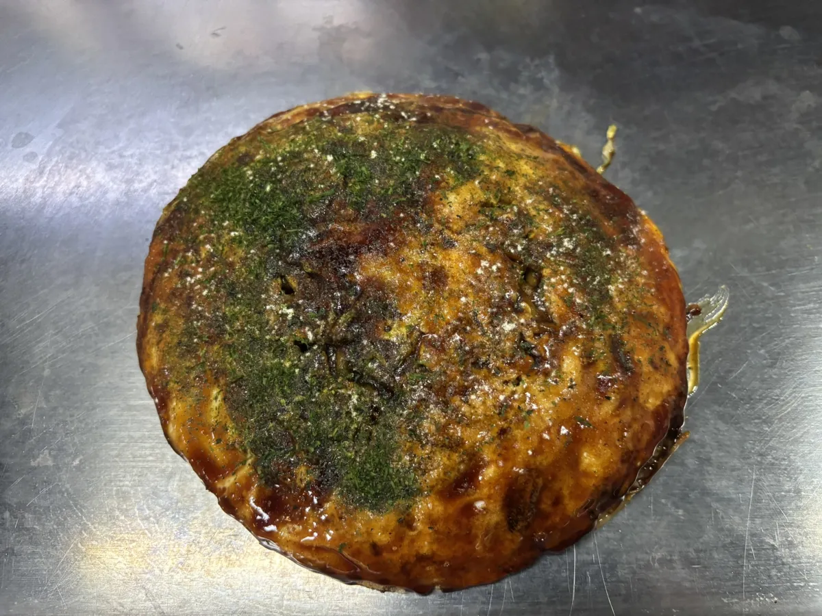 つかさでは「お好み焼きスペシャル(エビ・イカ・イカ天)」を注文。店側の“おすすめ”枠に入っている定番で、この組み合わせが人気No.1のようです。価格は1,200円。